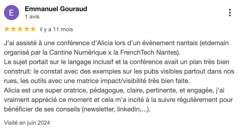« Ce que j’adore quand je termine une conférence, ce sont les gens qui me disent : « Merci, je n’avais jamais vu ça comme ça. Vous avez changé mon regard sur l’écriture inclusive ». Je sais que tout le monde ne va pas passer à l’action immédiatement, mais des graines sont plantées et l’esprit critique a été activé »